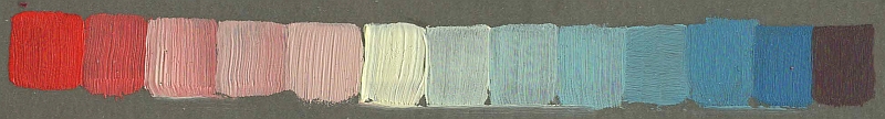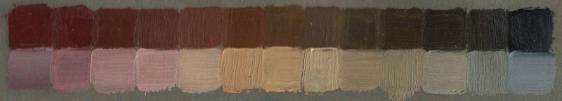 Above: Jackson's Mars violet - raw sienna - Payne's grey. Bottom string is a mix with white. At first glance this looks like a string of browns but, when you stop and pay attention, you can see that the full range of colour from red to blue is actually there. I love that subtlety.
