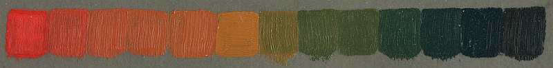 Above: cadmium red - ivory (nickel titanate yellow + plus white) - Prussian blue.