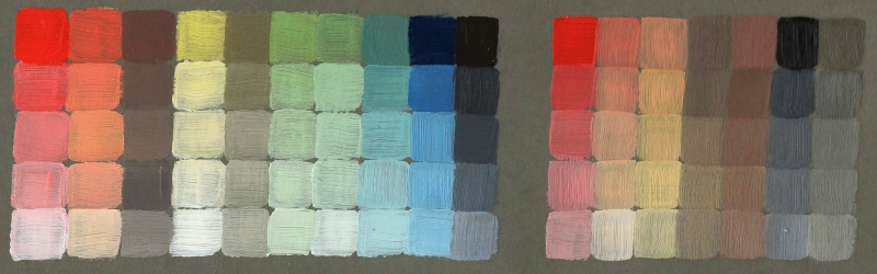 Left block: the colours I can make with cadmium red, nickel titanate yellow, Prussian blue, titanium white, and ivory black.