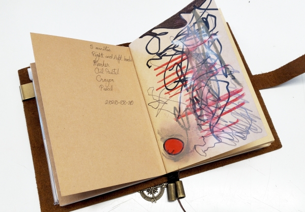 More importantly, though, is the physical effect the exercise has had on me. With my eyes closed I was very aware of the smells of the Sharpie marker and oil pastels. Using my non-dominant hand made me very aware of the feel of the material I was holding and how it felt moving over the paper. Being able to create without thinking for just five minutes pretty much had the effect of a good nap; I feel wide awake, refreshed, and energetic; ready to get on with and get the most out of my day.