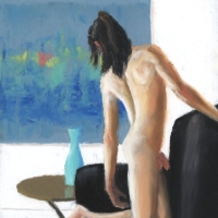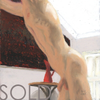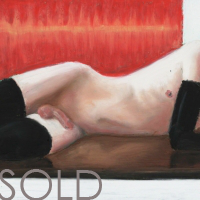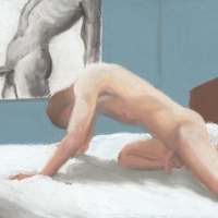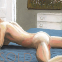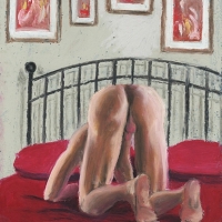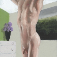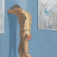 Oil pastel on card works of the male form displayed as art, alongside art, in intimately erotic scenes where the viewer becomes the voyeur.