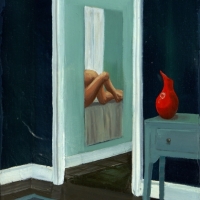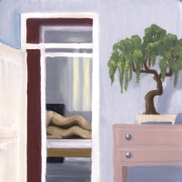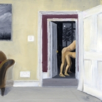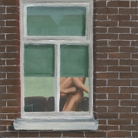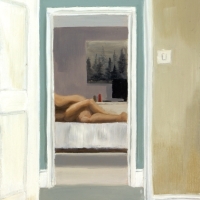 Glimpses of intimacy seen through the eyes of a hidden voyeur. Oil paint on prepared paper.