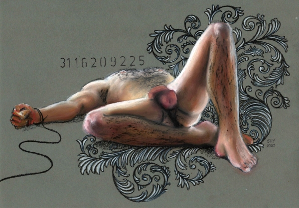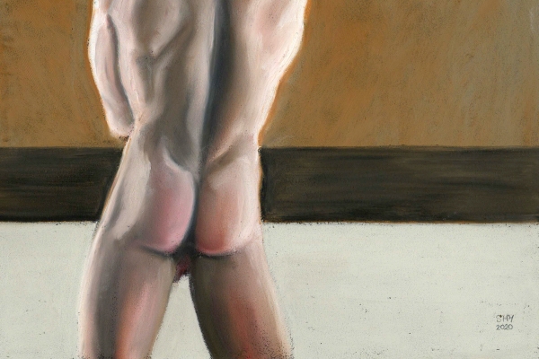 The most common mistake made with the Zorn palette is to mix a single flesh hue and just add black and white for darks and lights. This results in a very flat, monochrome figure. Observe the figure carefully and you can see that there are a hundred variations in colour on a single person. Hands, elbows, genitals, toes, soles of the feet, and the back of the neck tend to be much red or purple in hue than the trunk and limbs, which tend to be yellower. The belly and buttocks tend to be much more pale than the rest of the trunk. Where skin is thinner, such as inside the upper arms, it tends to be pale and ever so slightly green as the colour of the veins affects the appearance of the flesh. In the close up below you can see some of the different hues created purely by blending combinations of just those four different oil pastels.