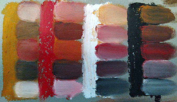 The oil pastels I tend to use are the Sennelier yellow ochre, the Neopastels ruby and white, and either the Van Gogh black or the Pentel black. The Senneliers red and black can be overpowering and difficult to control. The Van Gogh black is a good strong black but easy to control, and the Pentel black is much weaker, making smaller changes to value and hue easier.