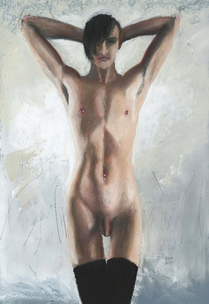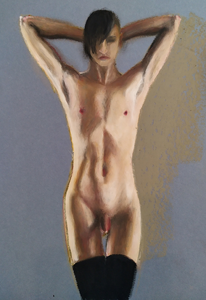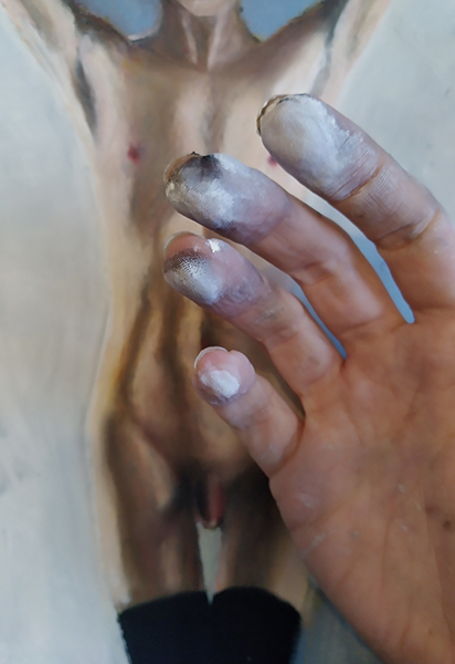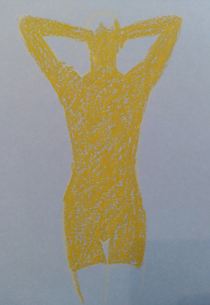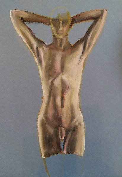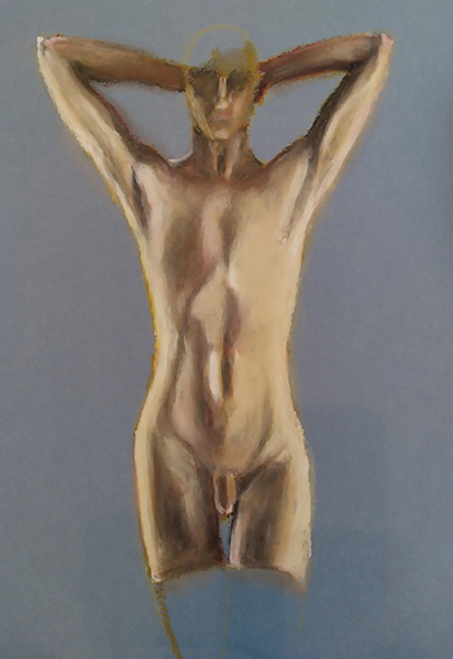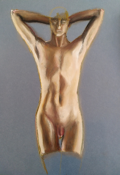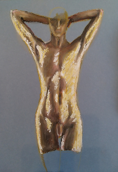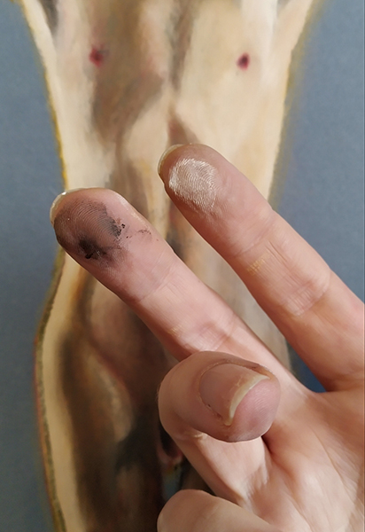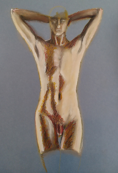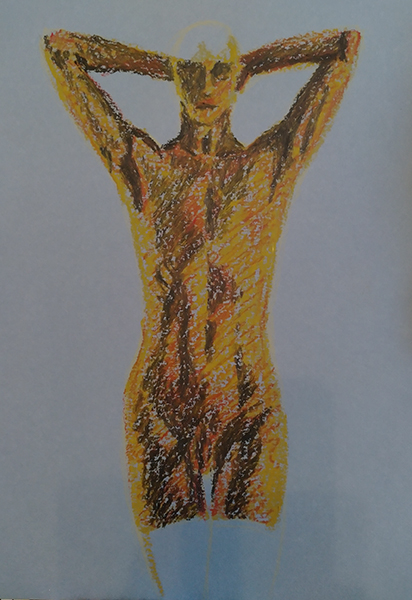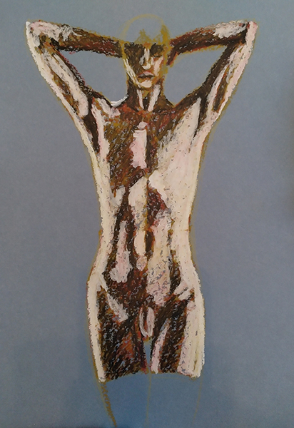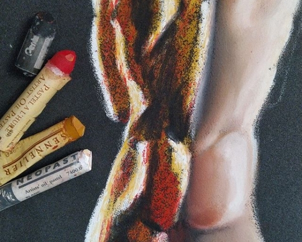 Once you're happy with the bulk of the figure, you can start with details and background. You can see the mess I got into blending the background. Fortunately the tactile nature of oil pastels is the thing about them I love most: