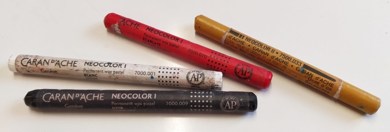 I'm in a bit of a rut and I'm shaking things up with trying new materials (but that's a different story). As I'm ridiculously fond of the Zorn palette, which consists of black, red, earth yellow, and white, I thought I'd try a quick 30 minute sketch in wax crayons. Crayons aren't just for children; Caran d'Ache Neocolour are lightfast, artist quality wax crayons: